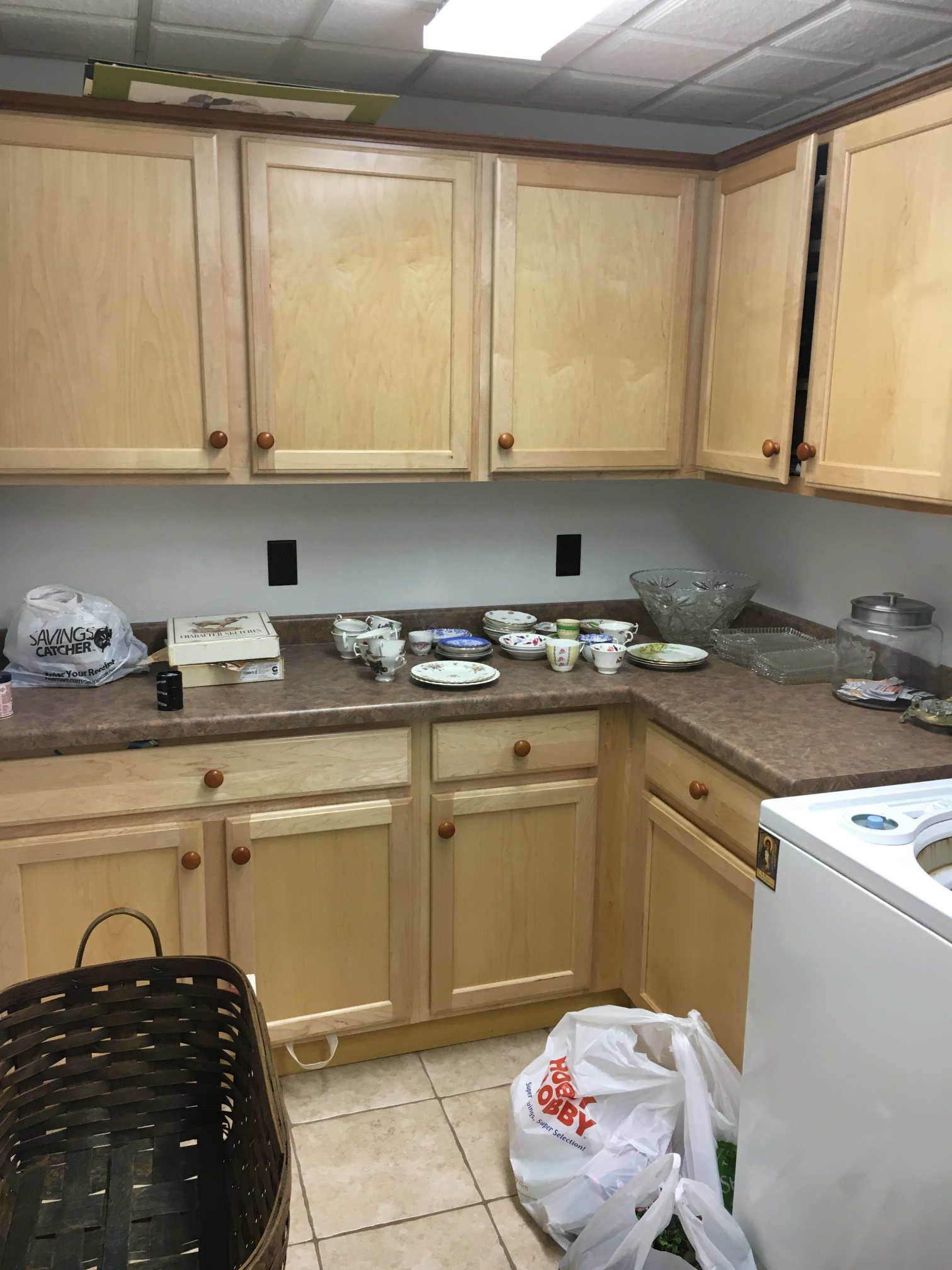This boring and blah laundry room is just begging for attention. I want to add some color to the walls, a place to sit and a place to hold books. I want to use the cabinets as a dish pantry to hold my extra dishes.