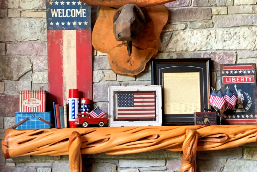 Our lakeside home is full of reds, whites and blues for Summer. Tour our Great Room and find how I mixed in vintage treasures for a Patriotic mantel. (Affiliate links read the post → about Summer Home Tour