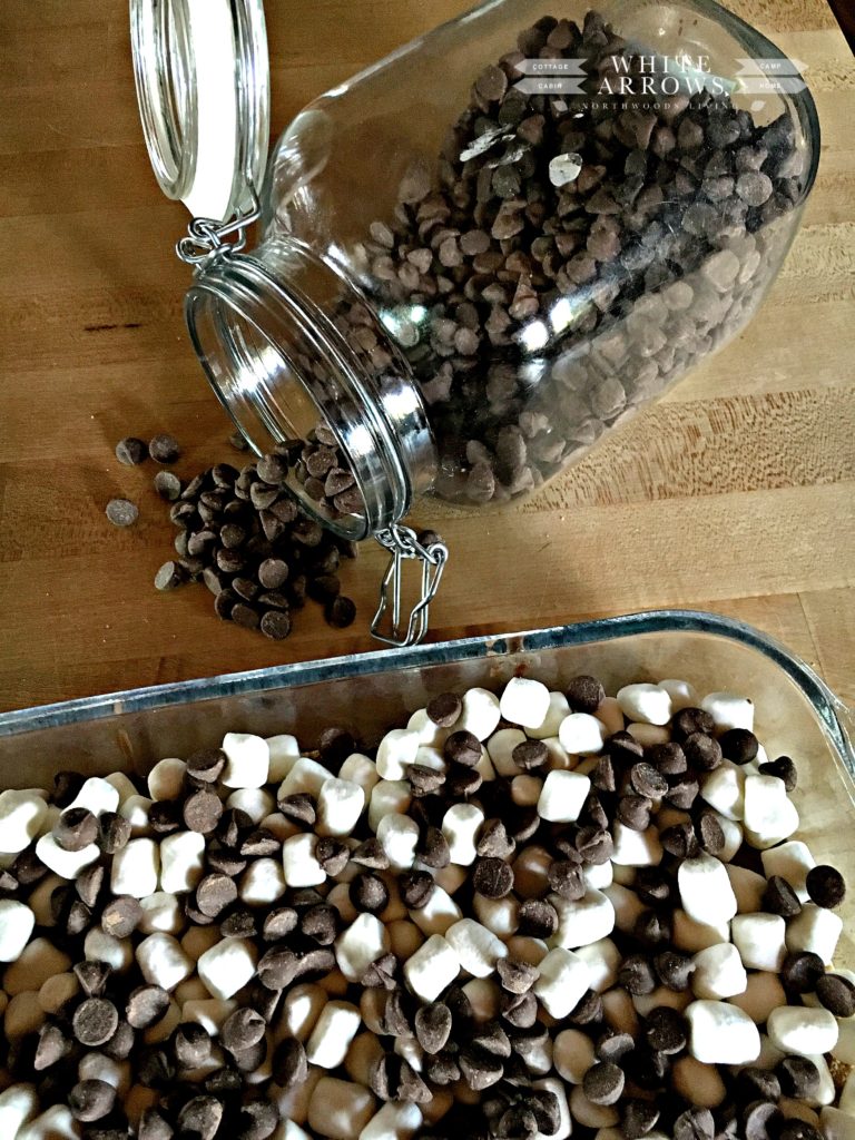 A layer of chocolate chips over the marshmallows is the final step. Then I bake them in the oven for about 30 minutes at 350 degrees.