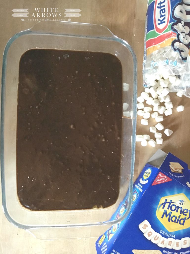 I start with a box of brownie mix and make it according to package directions pouring it into a greased 9×13 casserole dish.